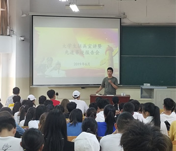 在资环楼104室举办大学生征兵暨先进事迹报告会,会议邀请后备军官学院办公室主任李好永担任主讲人。