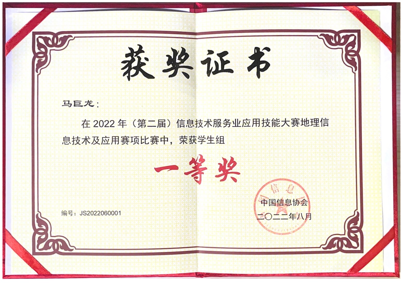 2019级地球信息科学与技术专业的马巨龙同学与海内外160多家高校院所和生产单位选手同台竞技,经过两轮激烈的奋战与角逐,最终该同学作为个人参赛选手荣获一等奖(排名第一),文广超老师荣获地理信息技术与应用技能大赛优秀指导老师。