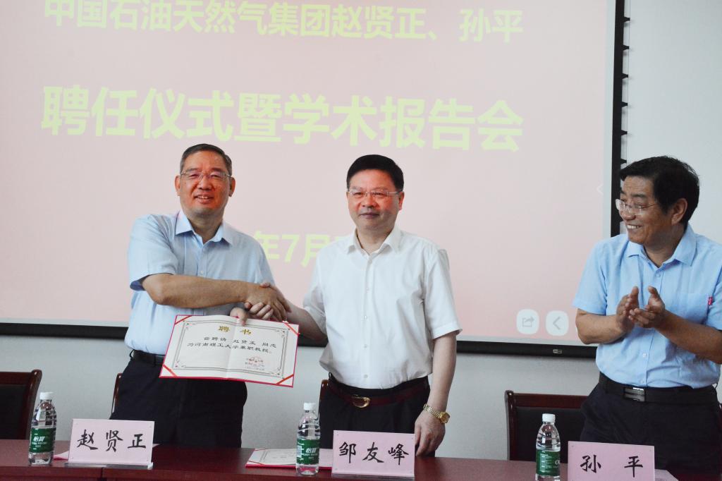 7月7日上午,中国石油天然气集团有限公司正高级工程师赵贤正、孙平受聘为我校兼职教授,其中,赵贤正作专题学术报告。聘任仪式暨学术报告会在我校国家重点实验室901报告厅举行。校党委书记邹友峰出席仪式,党办、好看视频