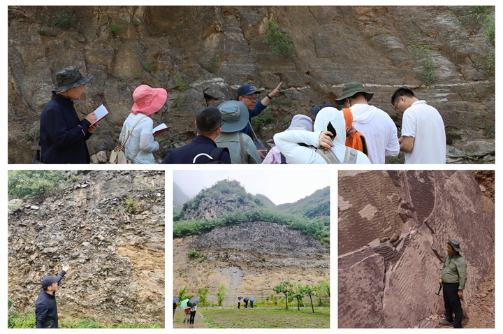 夏风微凉,细雨绵绵。参加活动的各位老师在曹高社教授和谢洪波教授的带领下,沿薄壁-宝泉水库路线,考察了新太古界幔岩-片麻岩结晶基底、中元古界云梦山红色砂岩沉积盖层,现代河流的地质作用等地质观察点和宝泉水库人类建设工程;沿龙洞-小刘庄-缝山针路线考察了凤凰岭大断层、地堑地垒、奥陶-石炭不整合、采矿遗迹;沿青天河-樱桃岭路线,冒雨从寒武系顶部三山子组白云岩一路追踪奥陶系马家沟组,石炭系本溪组铝土质泥岩、二叠系太原组下部L1-L4灰岩段、中部夹L5的碎屑岩段、上部L6-L7含燧石团块灰岩段;在红砂岭泥泞中曹教授带领大家追踪了废弃采矿坑;结合地质现象和自身科研,曹教授详细讲解了陆核的形成、地台区“双层结构”、地质灾害、断层体系等野外地质考察的技巧和生物化学岩与碳汇、上奥陶统古岩溶与天然气集气构造等地质学研究热点及新理论与成果。