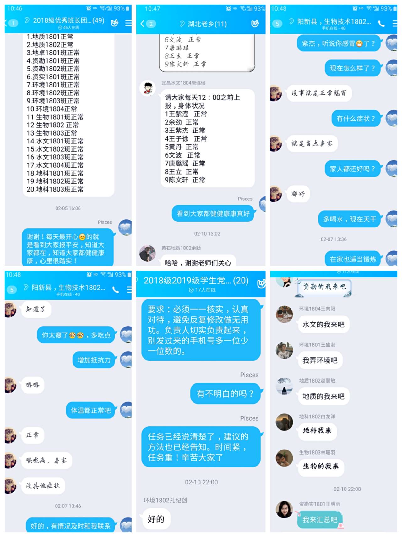 2019级辅导员宁淑媛,作为一名老辅导员,2003年的非典,我还是一名大三在校生,经历了几个月的封校,记忆尤深。面对突如其来的疫情,对新型冠状病毒一直比较敏感的我于腊月27那天在qq群里呼吁学生注意防范,敲响警钟!紧接着资源学院辅导员团队第一时间投入这场没有硝烟的战役中。腊月28,距离过年还有2天,我和陈青老师摸清了2019级所有湖北学生的情况,并一个一个打电话落实学生是否隔离,有没有症状,目前生活状况如何,让这些身在疫区的孩子们感受到来自母校的关爱。2020农历春节注定是难忘的,辅导员们用自己的行动对抗疫情,成了这个春节特殊的主题。大年三十、大年初一,我们放缓了与家人的团聚,利用微信、QQ、钉钉、微博等一切可以Q利用的媒介,提醒每一个同学关心自己和家人的身体情况,做好隔离和防护,隔离不隔心,断疫不断情,每一次qq头像的闪动、每一条温暖的消息都是我们对学生的惦念,都是辅导员的责任与良心!