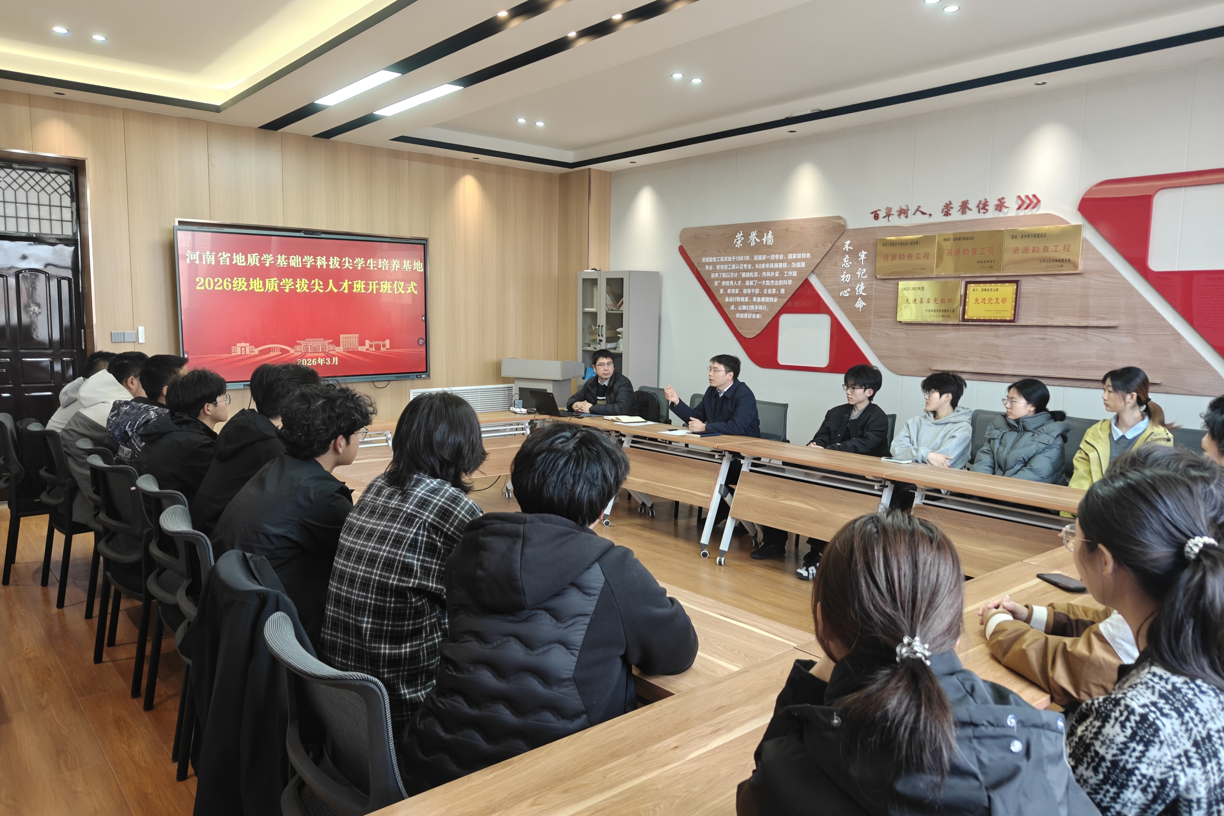 401会议室举行,学院领导、基地骨干教师及2025级拔尖班全体同学参加了仪式。仪式由资源勘查系副主任刘惟庆主持。