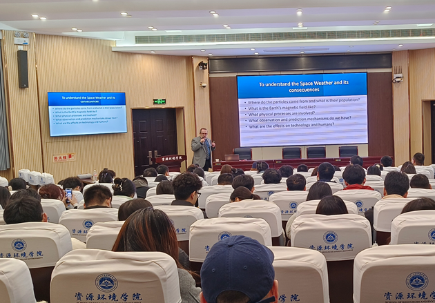 路易斯教授以“空间天气如何影响我们赖以生存的环境?”为题,系统介绍了空间天气的形成机制、对地球空间环境及人类社会运行系统的潜在影响,并重点阐述了科学界如何利用空间探测与地基观测手段进行空间天气监测、预警与防护。他结合自身参与的国际合作项目(如极端宇宙观测计划、国际空间站宇宙线观测任务等),分享了团队在空间辐射监测、宇宙线探测器研制以及卫星数据处理方面的最新进展。