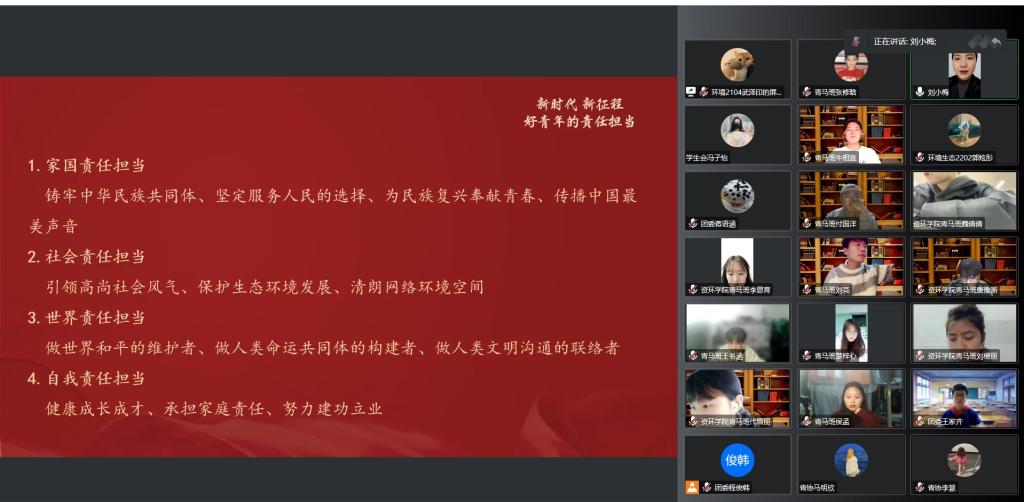 宣讲会上,刘小梅以“新时代新征程好青年的责任担当”为主题,从习近平总书记关于青年责任担当的重要论述、当代青年大学生所处的新时代历史方位、新时代高校青年应有的责任与担当三方面进行讲解,为青年大学生指明了方向,找准了定位,以青年的责任担当为中华民族伟大复兴贡献蓬勃力量。最后,刘小梅呼吁同学们牢记习近平总书记的嘱托,珍惜时代赋予的机会,在新征程上勇于担当,自觉承担起历史的重任,自信自强、守正创新,踔厉奋发、勇毅前行,让青春在全面建设社会主义现代化国家的火热实践中绽放绚丽之花。