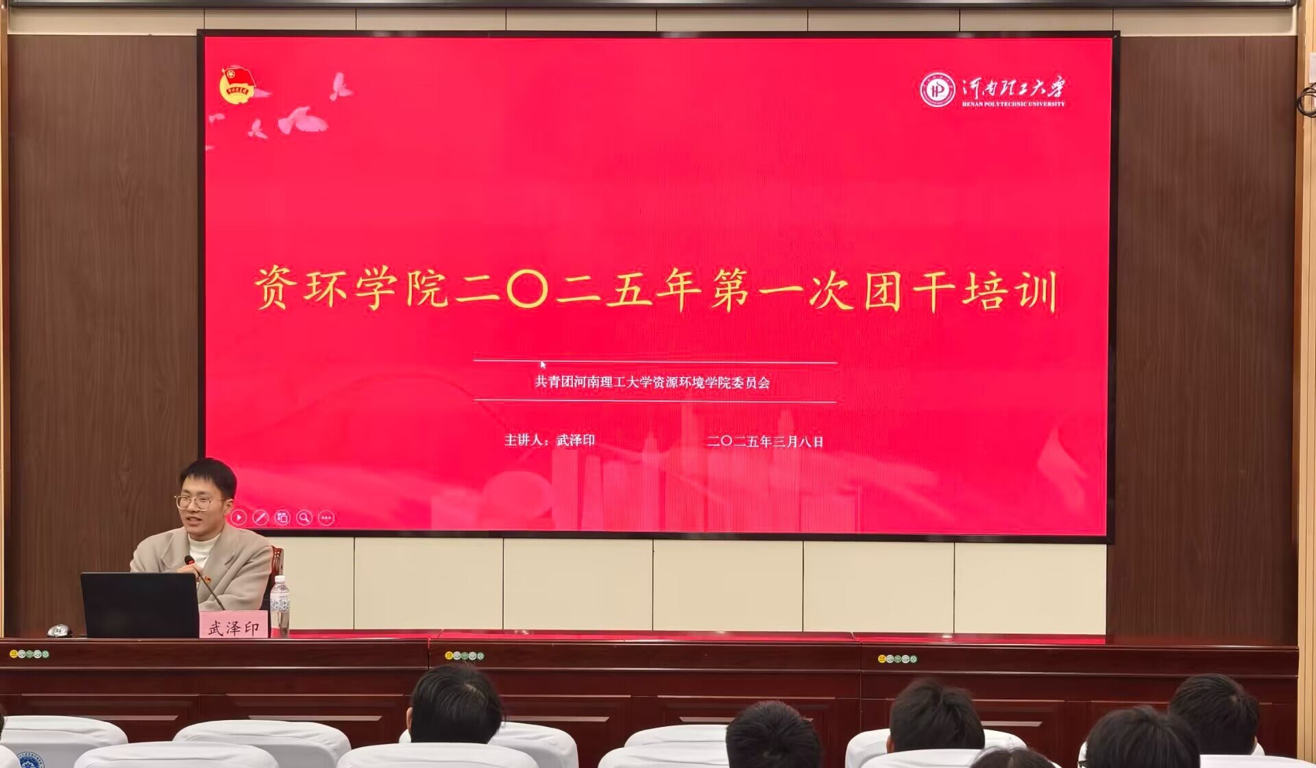 团委于3月8日晚上在院楼第Ⅰ学术报告厅举行2025年度首次团干培训会。此次培训邀请河南省三好学生、河南理工大学优秀学生干部、优秀学生团干部武泽印同学担任主讲嘉宾,三十余名团学骨干共同参与。