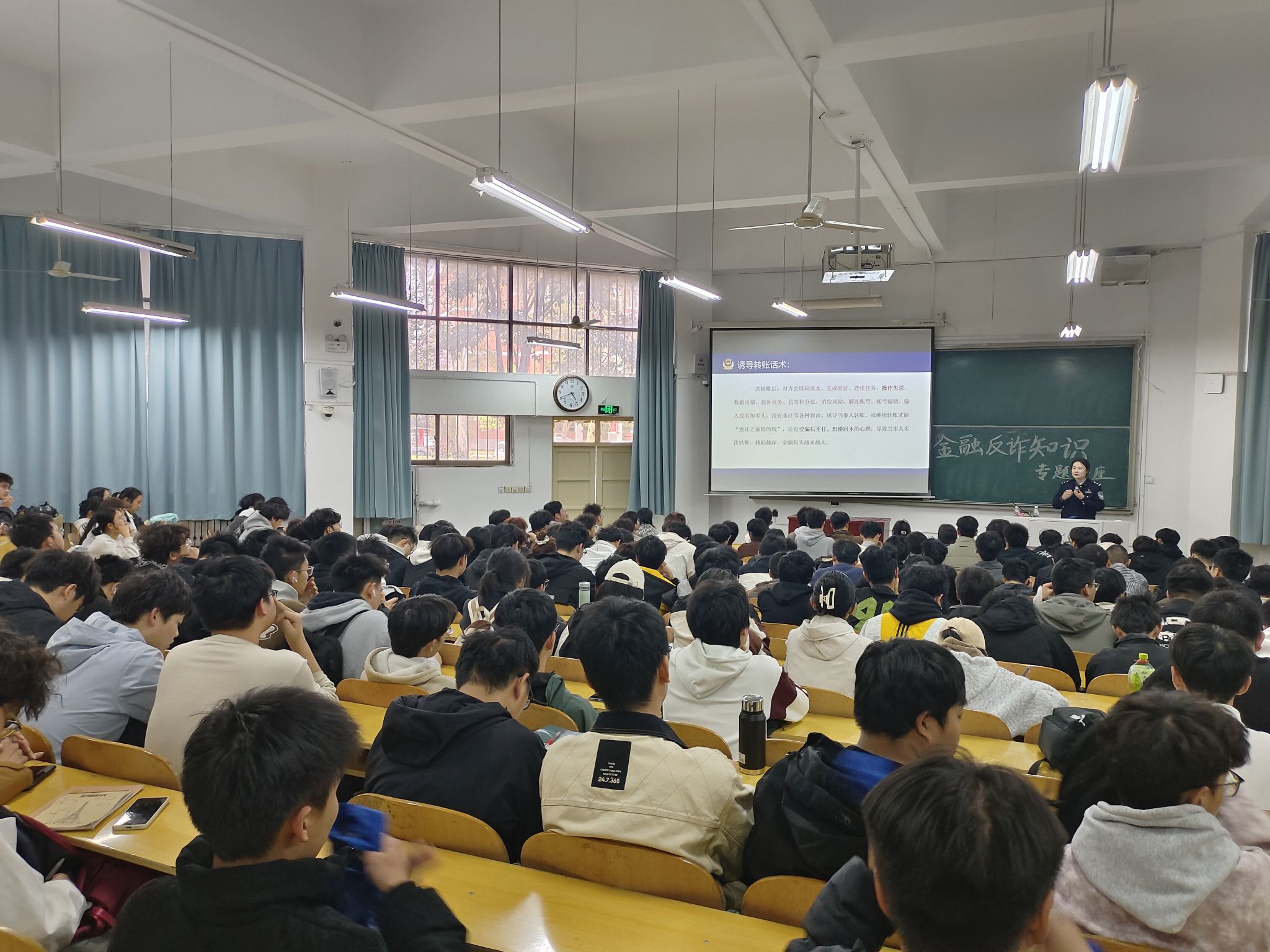 活动中,两位警官首先通报了近期高发的诈骗案件数据,通过真实案例揭示了诈骗犯罪的危害性。结合大学生群体特点,重点剖析了三类校园常见诈骗手法:一是利用个人信息泄露实施的精准诈骗;二是以兼职刷单为诱饵的诈骗;三是游戏账号交易类诈骗。针对毕业季学生群体易发生的游戏账号交易风险,警官特别提醒需通过正规平台交易,避免私下转账。此外,警官还深入解析了网络敲诈勒索、新型诱导刷单等复合式诈骗的作案特征,强调“三不”原则:不轻信、不转账、不泄露个人信息。为帮助同学们有效防范,提出三点建议:一是安装“国家反诈中心”APP并开启短信、电话预警功能;二是涉及财物交易时坚持“慢处理”,多问,多思,多想,通过多方核实规避风险;三是建立互助提醒机制,师生共同传播反诈知识。